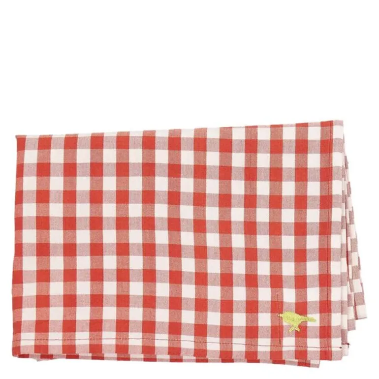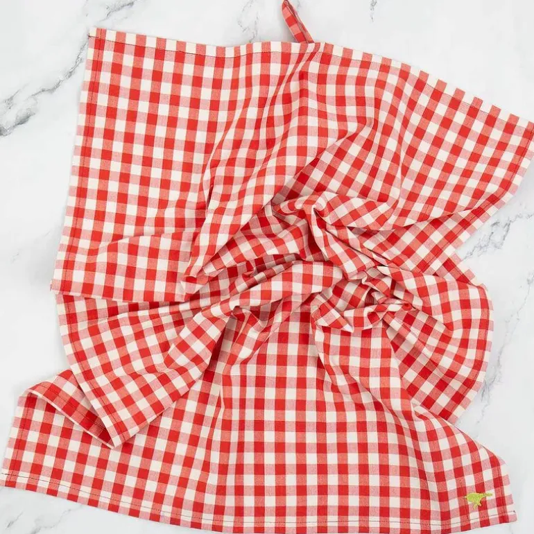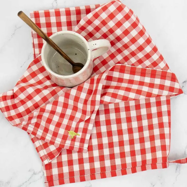 Maria kjøkkenhåndkle fra A World of Craft er håndvevd i 100 % økologisk bomull. Det røde og naturfargede rutemønsteret gir en klassisk, men livlig følelse på kjøkkenet. Produsert av en WFTO-godkjent organisasjon og dekorert med en håndbrodert gul fugl – et symbol på håndverk og rettferdig produksjon.