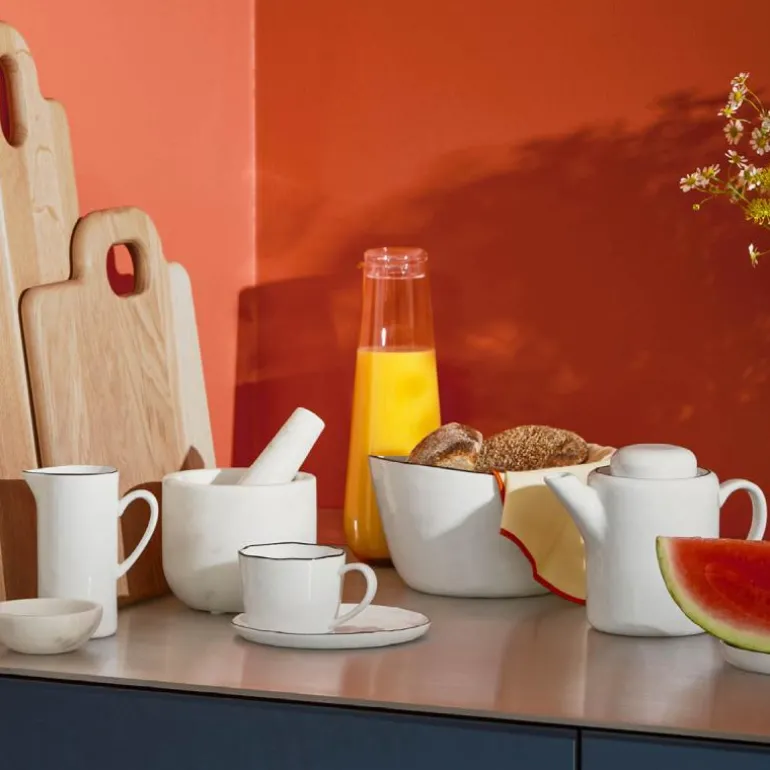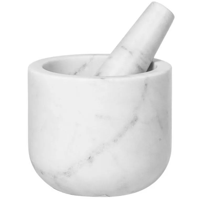 Fin og praktisk morter, Marina, i hvit marmor fra Broste Copenhagen. Både morter og pistel er i marmor, og gjør den meget dekorativ selv når den ikke er i bruk.Broste Copenhagen er et av Skandinavias ledende interiørmerker, basert i København og har sin opprinnelse tilbake til 1955. De har en lang tradisjon for å reise verden rundt for inspirasjon og materialer, slik skandinaver alltid har gjort.Broste Copenhagen er mer enn bare interiørdesign. Det er en livsstil som de er ivrige etter å dele med verden rundt seg. Derfor lager Broste Copenhagen produktene sine for å nå et bredt spekter av kunder, ikke bare de få. De har et dynamisk team som jobber kontinuerlig med å utvikle sortimentet med respekt for den fine balansen mellom den nordiske tradisjonen og tidens trender. Den originale følelsen av materialet og dets karakter forblir intakt – med skånsom behandling og fokus på høy kvalitet så vel som Broste Copenhagens velkjente nordiske signatur i det endelige designet.