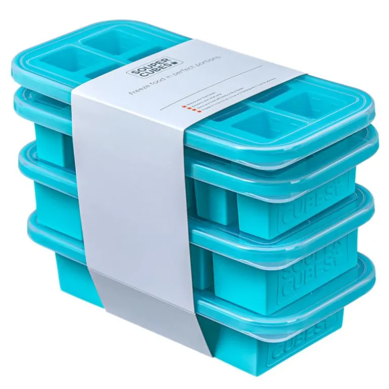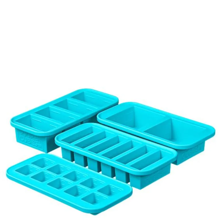 Gavesett med 4 silikonformer/fryseformer i fargen aqua, fra Souper Cubes. En pakke inneholder 4 stk former med lokk; 2-cup (2 rom à 500ml), 1-cup (4 rom à 250 ml), Half-cup (6 rom à 125 ml), Tbs (10 rom à 30 ml).