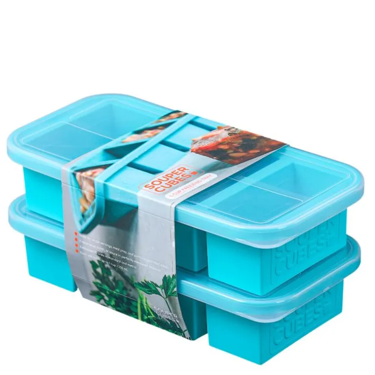 Silikonform/fryseform 1-cup aqua, fra Souper Cubes. En pakke inneholder 2 stk former med lokk. Hver form har 4 rom à 250 ml.