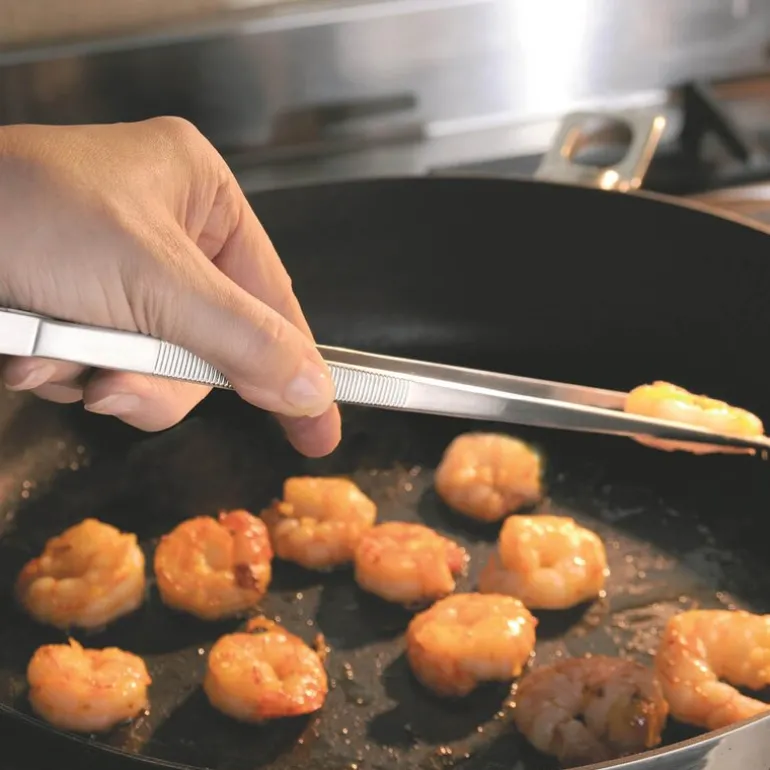 De rillede endene gir et sikkert grep, enten du håndterer stekt kjøtt, grønnsaker eller finere retter. Den balanserte fjæringen sikrer optimal kraftoverføring, noe som gjør pinsetten enkel og behagelig å bruke. Laget av rustfritt stål, tåler den oppvaskmaskin og har en opphengsløkke for praktisk oppbevaring.