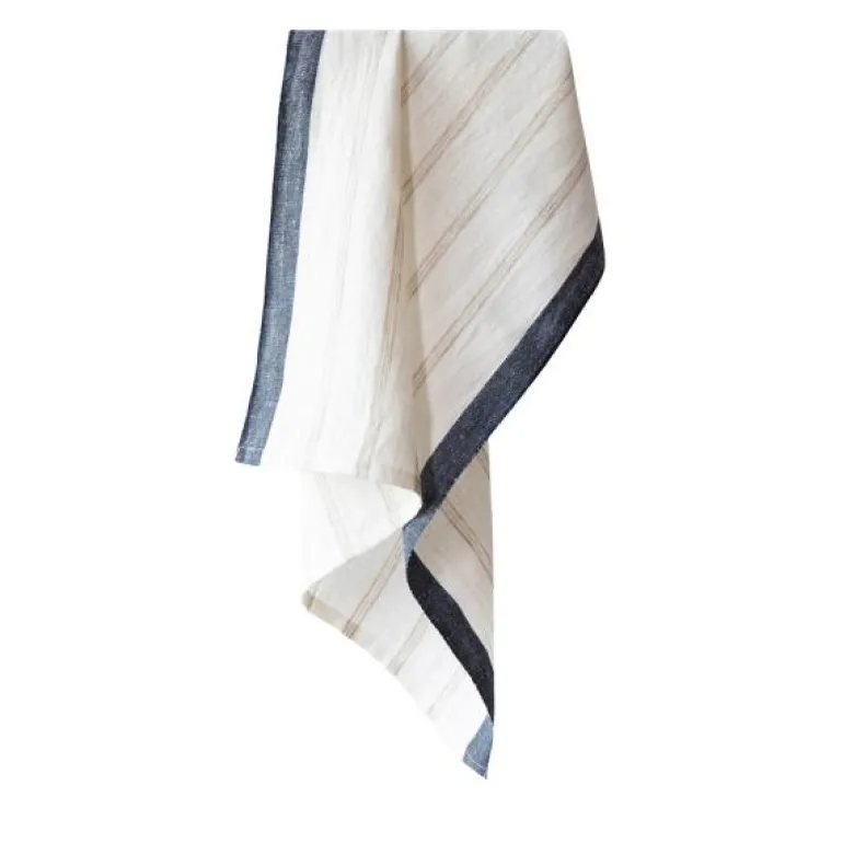 Kjøkkenhåndkleet er utstyrt med hempe i det ene hjørnet. I tekstilserien Maya finner du kjøkkenhåndklær og servietter i fargene Navy stripe og Natural stripe.