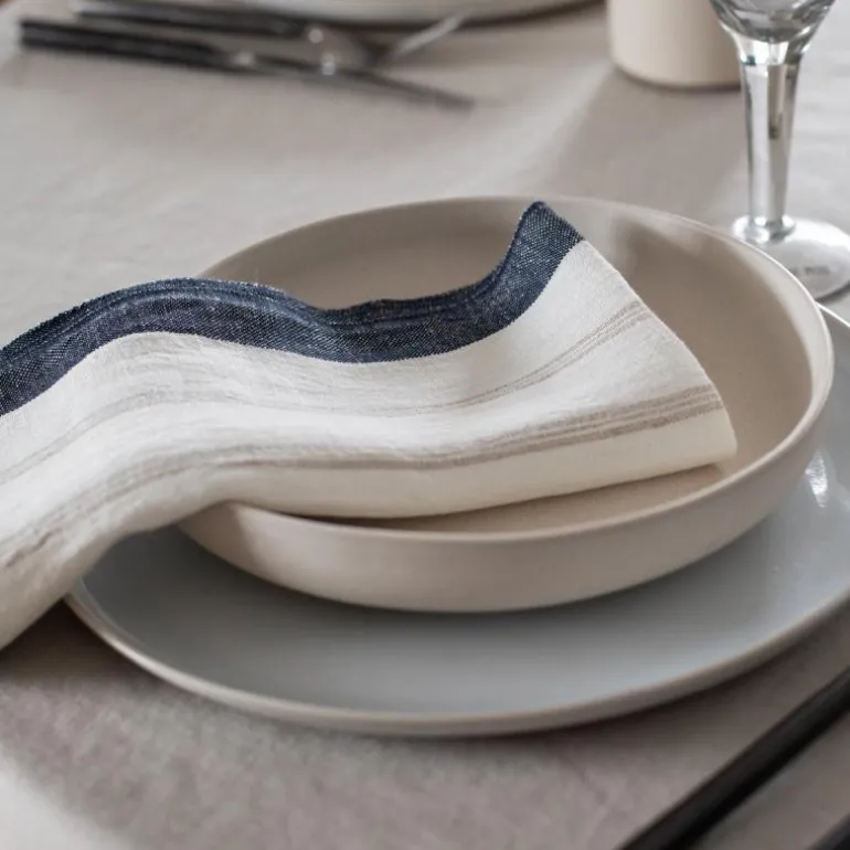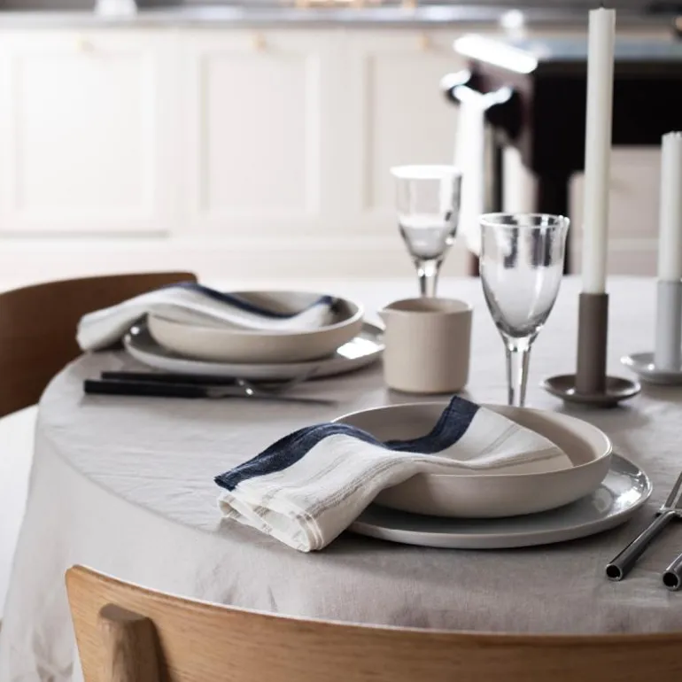 Maya er i en tynnere linkvalitet og har en vakker tekstur som gir et tidløst inntrykk og vil leve sesong etter sesong. Lin har god sugeevne, tørker raskt, er slitesterk og varer over tid og egner seg derfor utmerket til serviett. I tekstilserien Maya finner du servietter og kjøkkenhåndklær i fargene Navy stripe og Natural stripe.