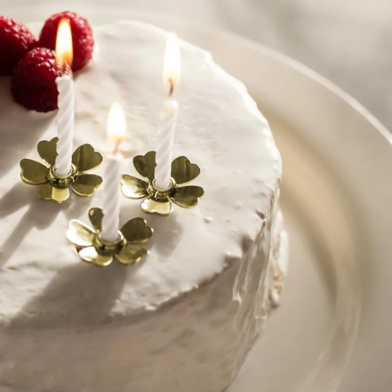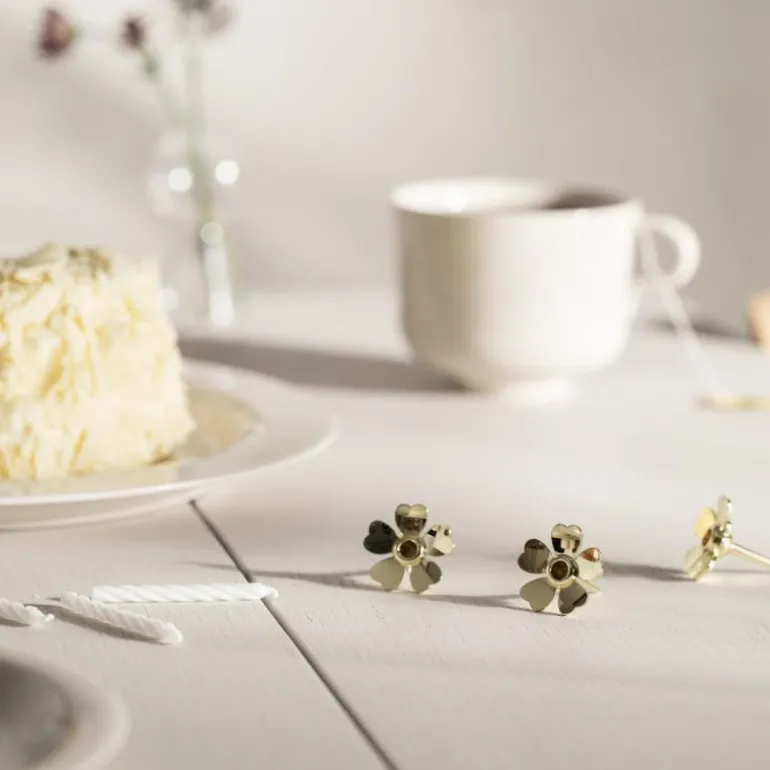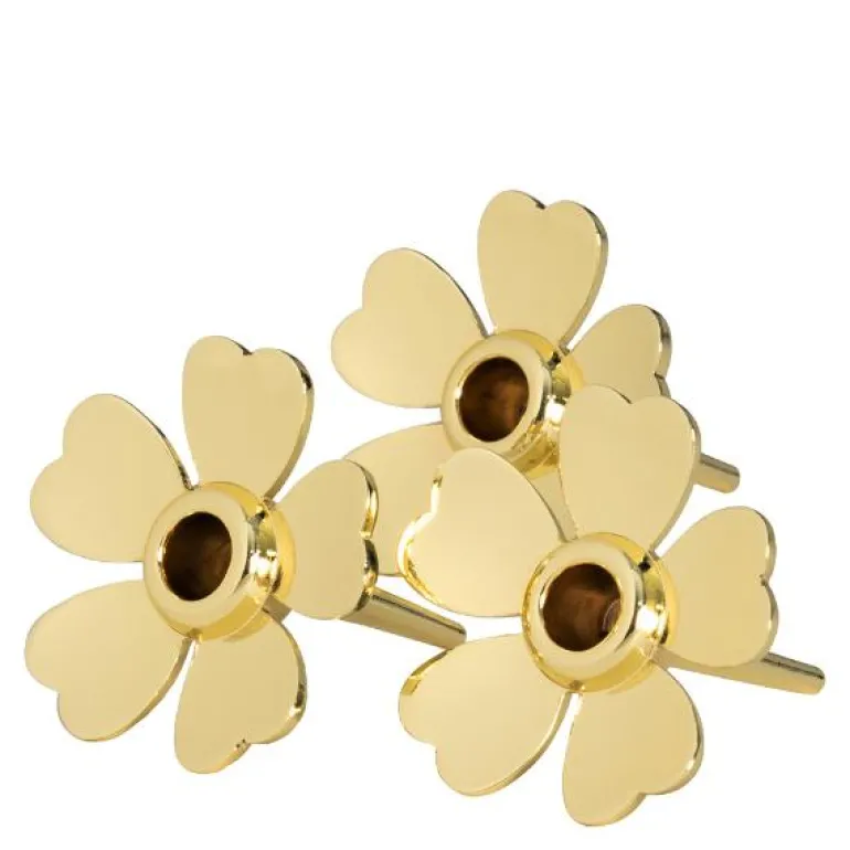 Tre stykk gullfargede, blomsterformede lysestaker til kakelys, Me To You, fra Design House Stockholm. Søren Niedziella har formet lysestakene av ekte evigvarende materialer i stedet for kasteplast. Me To You blir igjen etter at lysene er blåst ut og festkaken er ferdig.
