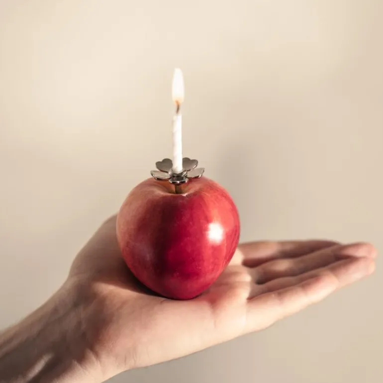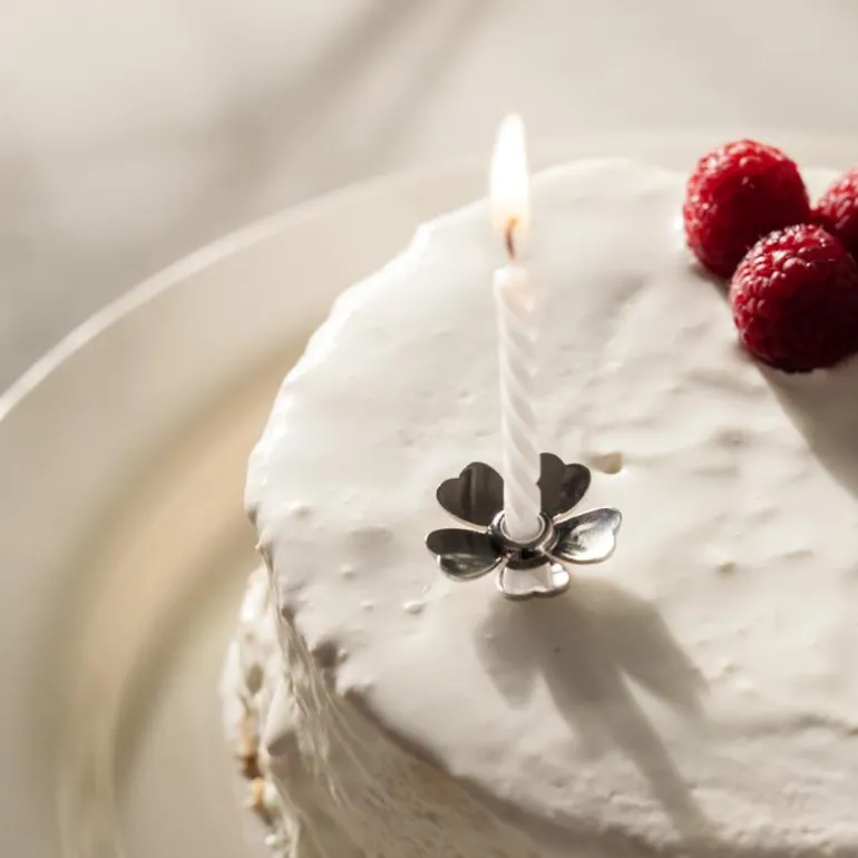 Sølvfarget, blomsterformet lysestake til kakelys, Me To You, fra Design House Stockholm. Søren Niedziella har formet lysestakene av ekte evigvarende materialer i stedet for kasteplast. Me To You blir igjen etter at lysene er blåst ut og festkaken er ferdig.