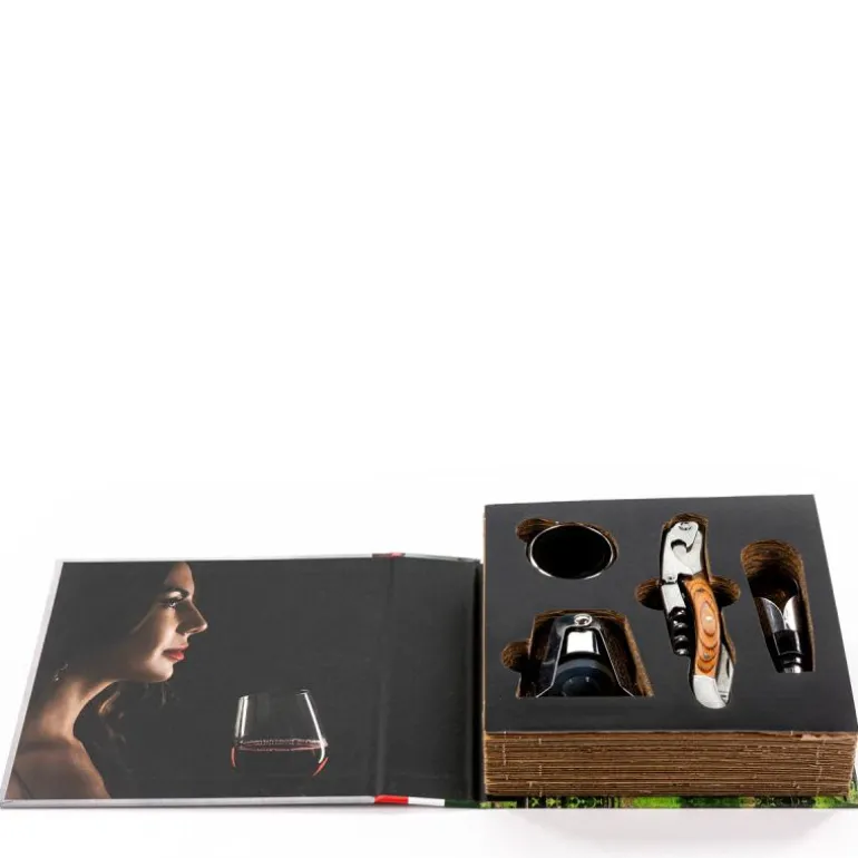 Eksklusivt vinsett fra Legnoart. Dette settet består av 4 deler. Det er en luksuriøs korketrekker med et fint håndtak og en tagget foliekniv. Med dette settet mangler du ingenting for en kveld i vinens tegn, det er en helletut med bred åpning for bedre oksygenering av rødvin, samt en dryppfanger i rustfritt stål. Hvis champagnen eller vinen må oppbevares og holdes fersk til neste dag, kan du bruke champagneproppen, den føres over åpningen og presses ned for en tett lukking. Settet kommer i en fin gaveeske.