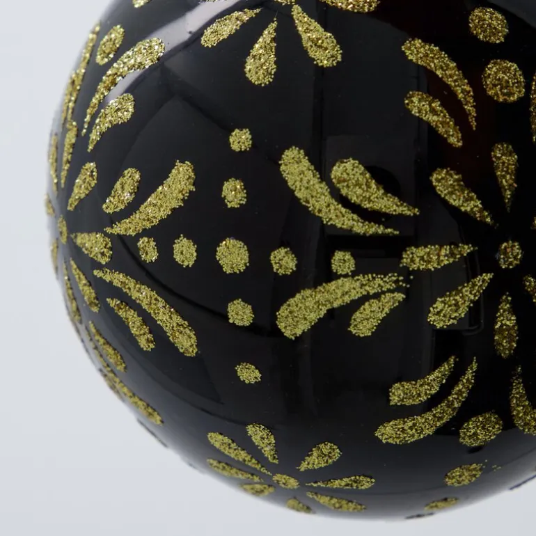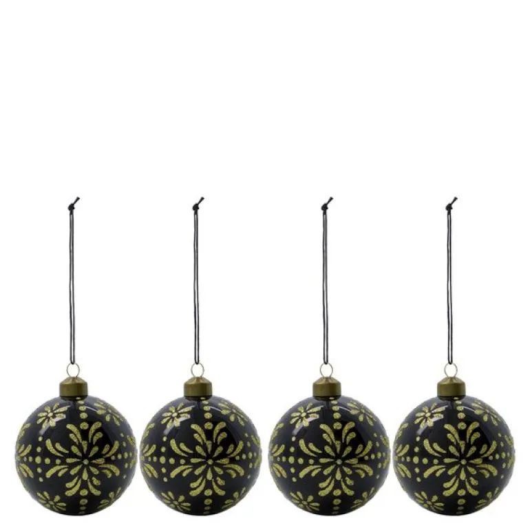 Mente julekuler fra House Doctor er et elegant sett med fire glassdekorasjoner som tilfører juledekorasjonen din et sofistikert og stilig preg. Med en diameter på 8 cm har disse sorte kulene et vakkert gyllent glittermønster som skaper et dypt og klassisk preg, enten de henger på juletreet eller arrangeres på et dekorativt brett på spisebordet. Den mørke basen sammen med det skimrende mønsteret gjør dem til et perfekt komplement til gullfargede dekorasjoner eller andre mørke nyanser, og gir et festlig, gjennomtenkt og eksklusivt uttrykk.