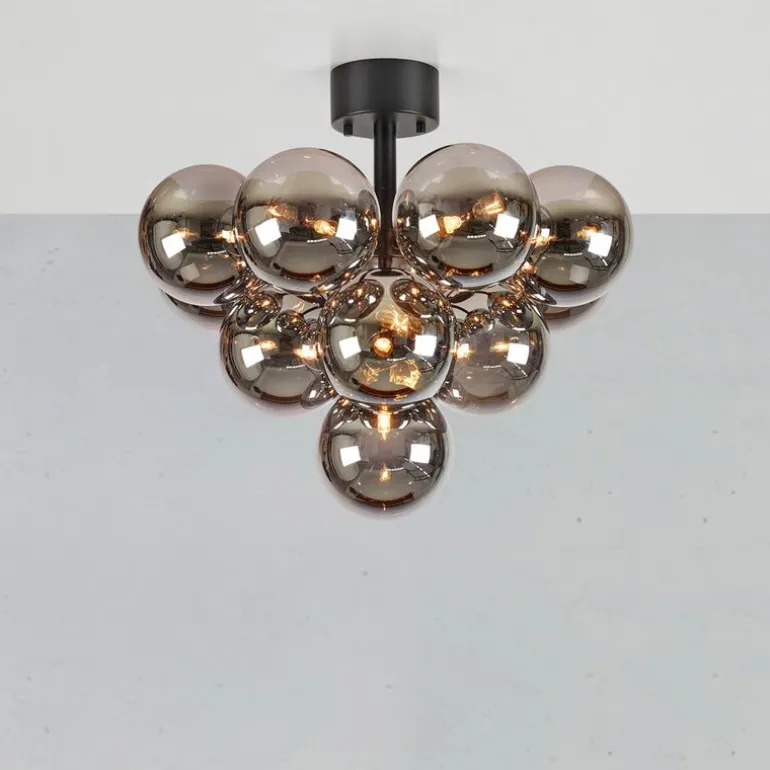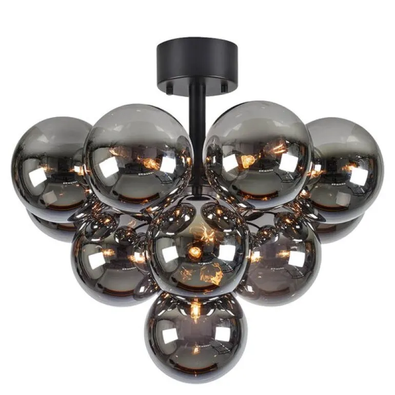 Merlot plafond taklampe i matt svart/smoke taklampe fra Markslöjd er en luksuriøs taklampe som kombinerer moderne design med funksjonell belysning. Lampen har en base i matt svart metall, omgitt av 13 elegante røkfargede glasskuler som sprer et varmt og innbydende lys.