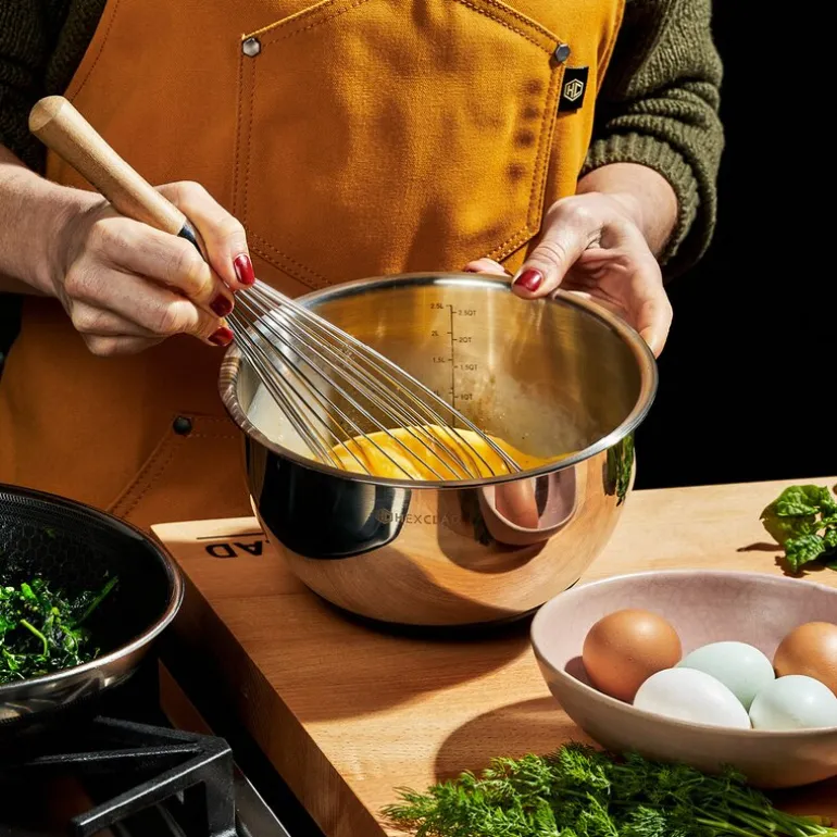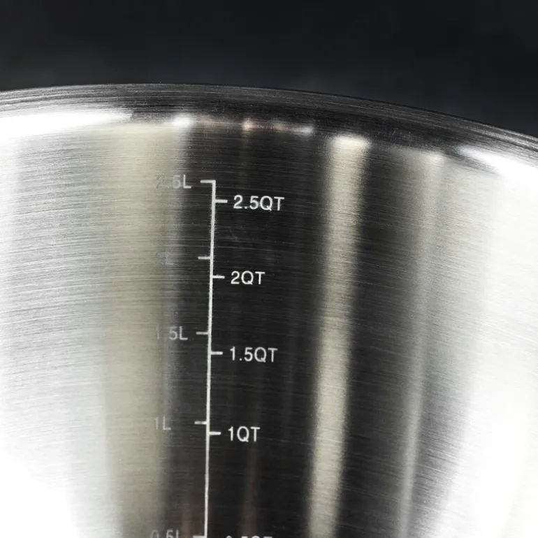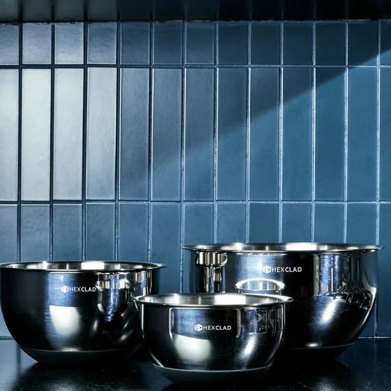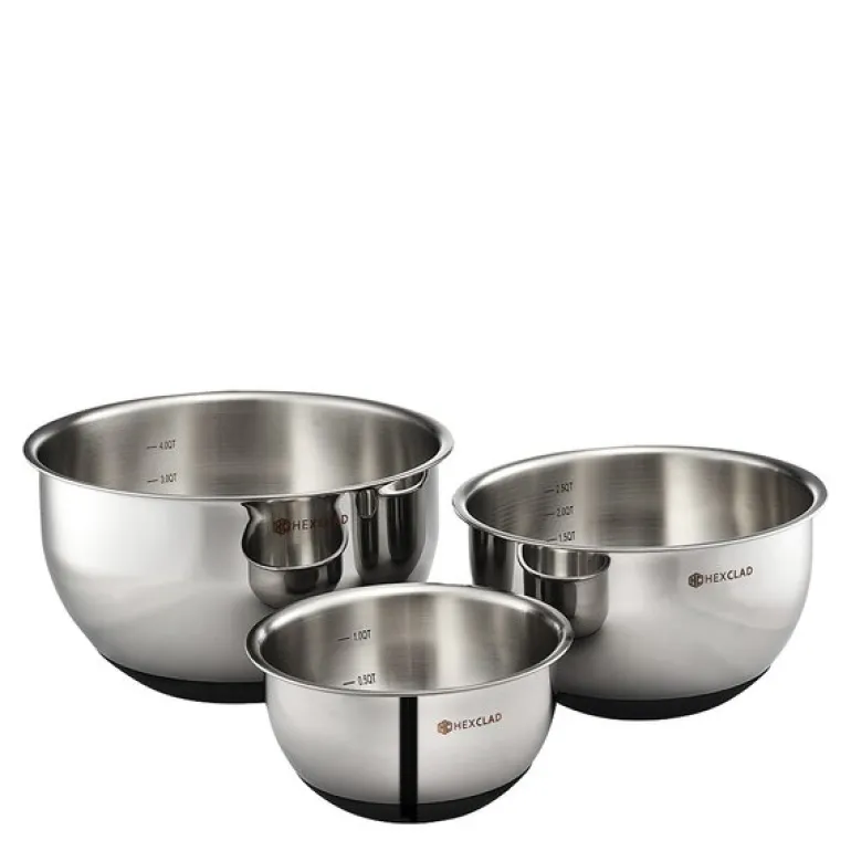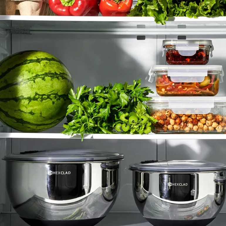 Hexclads sett med tre boller i rustfritt stål, komplett med patenterte vakuumlokk, er en ideell løsning for å redusere matsvinn og holde maten fersk lenger. Dette settet inkluderer tre boller i forskjellige størrelser som rommer henholdsvis ca. 1,4 liter, 2,8 liter og 4,7 liter, noe som gjør dem perfekte for en rekke bruksområder på kjøkkenet.