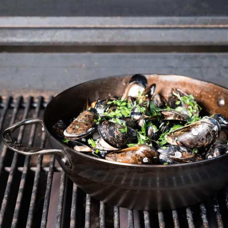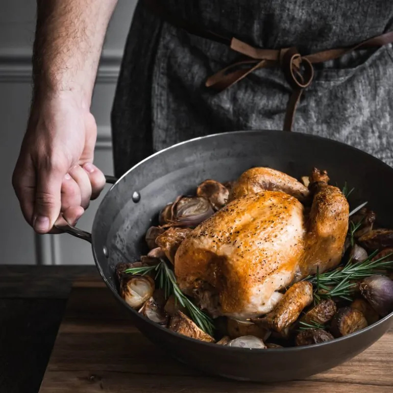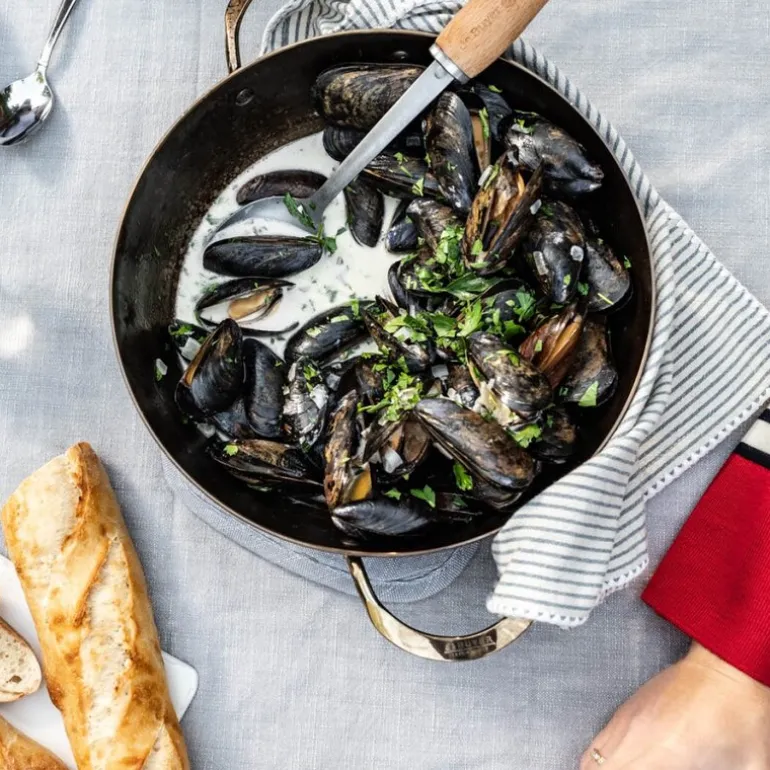 Pannen er forbehandlet med naturlig, fransk bivoks. Før første gangs bruk skal pannen ‘stekes inn’ med en behandling som kalles «»seasoning»»: Rengjør pannen med varmt vann. Hell ca 1mm matolje i pannen, og varm til oljen begynner å ryke. Bunnen skal bli litt brun. Hell ut oljen og tørk pannen med et kjøkkenhåndkle. Pannen er nå klar for bruk. Skal ikke vaskes i oppvaskmaskin. Etter hver bruk skal pannen vaskes med varmt vann, og tørkes forsiktig før den lagres. De Buyer er en anerkjent fransk produsent av kjøkkenutstyr med en stolt historie som strekker seg tilbake til 1830. Grunnlagt i landsbyen Le Val-d’Ajol i Vosges-avdelingen, har selskapet etablert seg som en pålitelig leverandør av høykvalitetsprodukter for matlaging.