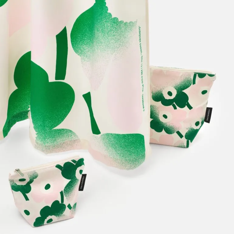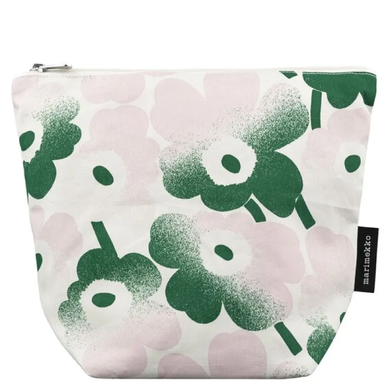 Marimekkos Mini Unikko-toalettveske kombinerer funksjonalitet og estetikk i en praktisk størrelse på 28×24 cm. Laget av bomull med det tidløse Mini Unikko Häivähdys-mønsteret, trykket i Helsinki, har vesken en slitesterk konstruksjon og et innvendig fôr av resirkulert polyester som beskytter innholdet. Den har en glidelåslukking og to innvendige lommer som gir ekstra organisering.