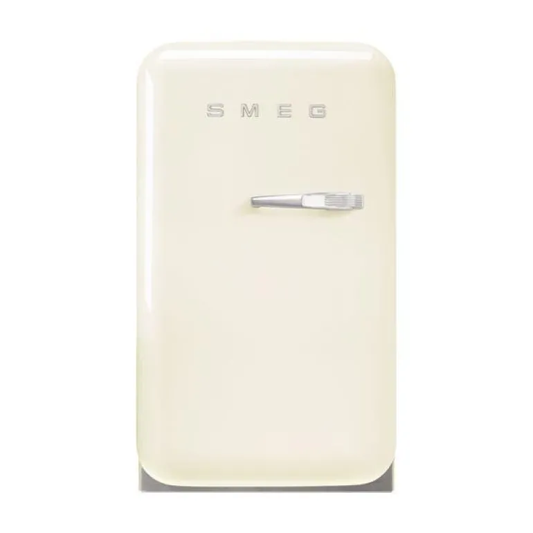 Lite kjøleskap/minibar i krem, FAB5 med venstrehengt dør, fra Smeg. Inspirert av 50-tallets design, utstråler dette ikoniske, frittstående kjøleskapet tidløs eleganse og vil være et iøynefallende tillegg til ethvert kjøkken.