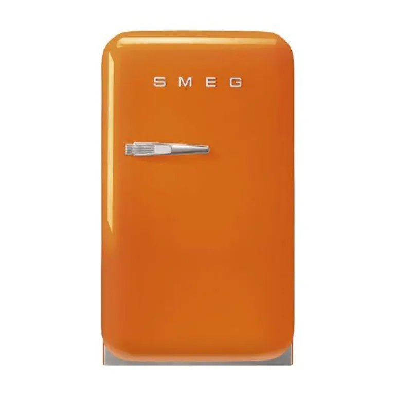 Lite kjøleskap/minibar i oransje, FAB5 med høyrehengt dør, fra Smeg. Inspirert av 50-tallets design, utstråler dette ikoniske, fristtstående kjøleskapet tidløs eleganse og vil være et iøynefallende tillegg til ethvert kjøkken.