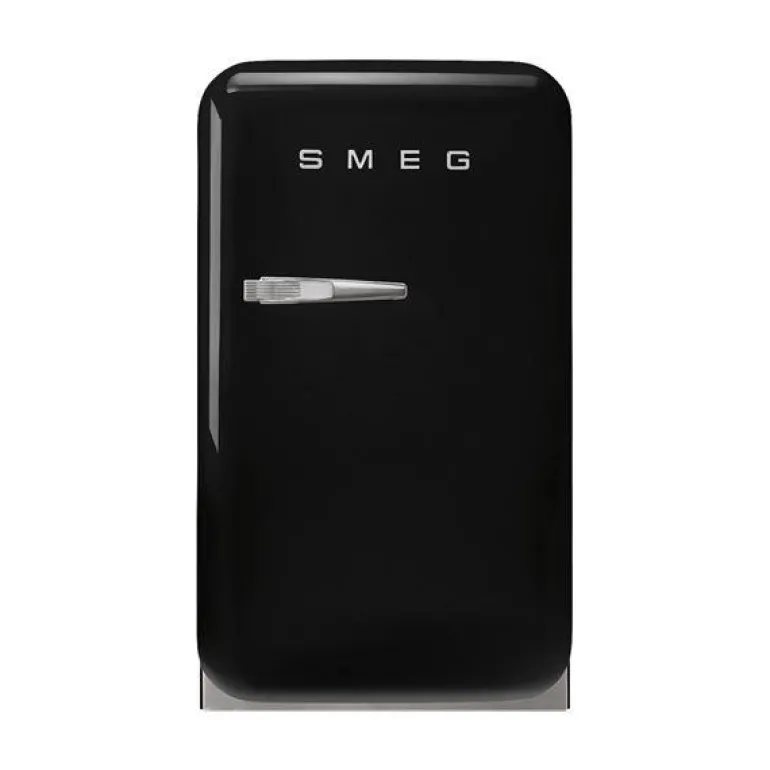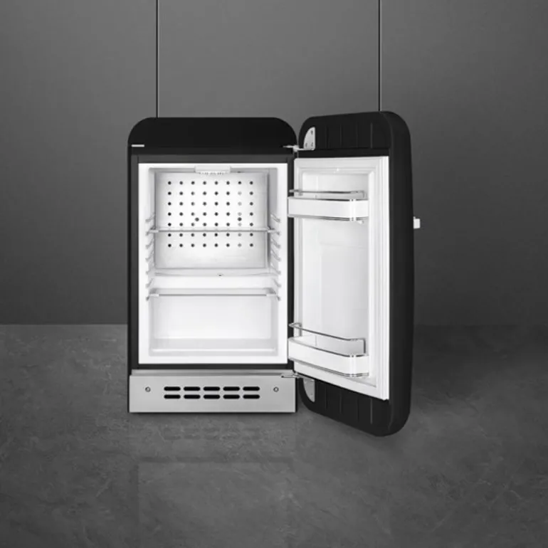 Lite kjøleskap/minibar i svart, FAB5 med høyrehengt dør, fra Smeg. Inspirert av 50-tallets design, utstråler dette ikoniske, fristtstående kjøleskapet tidløs eleganse og vil være et iøynefallende tillegg til ethvert kjøkken.