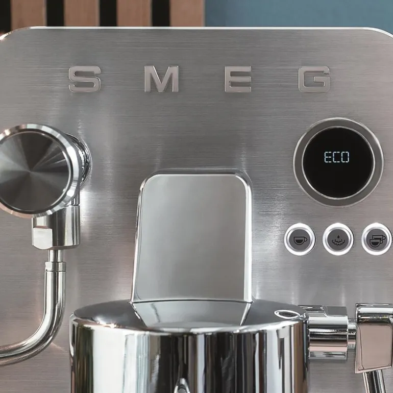 Espressomaskinen leveres med et omfattende sett tilbehør som inkluderer en kaffetamper i rustfritt stål, melkekanne, rengjøringsbørste og teststrimmel for vannets hardhet. Maskinen er også kompatibel med Smegs kaffekvern CGF02, som gir presis maling av kaffebønner for det beste bryggeresultatet.