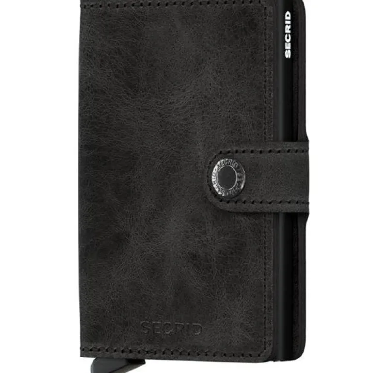 Secrid Miniwallet Vintage black har skinnomslag som er forsiktig slipt og vokset slik at overflaten får et stenvasket utseende der riper og slitasje vil sette seg i læret og gi lommeboken et levende og personlig uttrykk over tid.Selve kortholderen er i aluminium med patentert skyvesystem som gjør det enkelt å få tak i akkurat det kortet du trenger ved hjelp av et lett trykk på utløserknappen. Kortholderen beskytter kortene fra å bøyes eller knekke, og sikrer kortene mot tyveri ved at den blokkerer for trådløs avlesning. Med plass til 4-6 kort.Omslaget i mykt skinn gjør at kortholderen fungerer som en liten lommebok med plass til sedler, billetter og annet.Secrid har stor suksess med sin kortholder som ble lansert i 2009,og mye av dette skyldes en unik kombinasjon av moderne produksjonsteknikker , godt kvalitesskinn og et gjennomtenkt design.Selve kortholderen er i aluminium og dette gir den lav vekt , men beskytter også kortene mot å bøyes eller knekke, og den sikrer kortene mot tyveri så lenge de er inni kortholderen.(RFID sikker ; radio-frequency identification).Ved hjelp av en liten knapp skyves kortene ut av holderen slik at man enkelt får tak i det kortet man skal bruke.Secrid Miniwallets er et stort spekter av kortholdere med skinnomslag som gjør at kortholderen også fungerer som en liten lommebok der man kan oppbevare sedler ,billetter og annet.Hver kortholder rommer 4-6 kort ; 4 kort med opphøyet preging og opp til 6 kort uten preging.