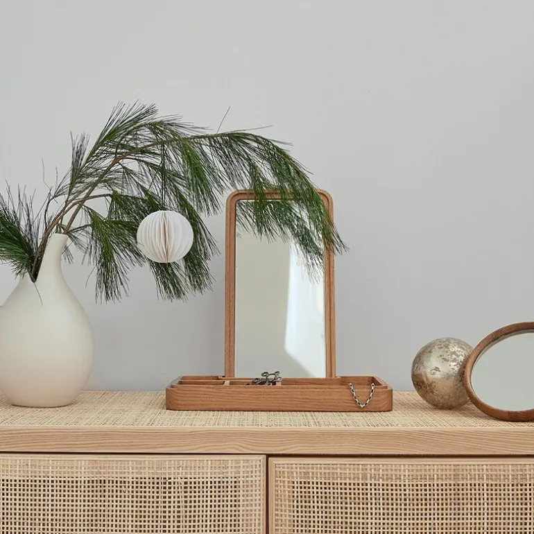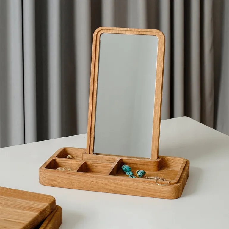 Mirror Box oppbevaringsboks med speil 5,2×32 cm eik fra Spring Copenhagen. Mirror Box har det klassiske gamle smykkeskrinet som utgangspunkt, men er samtidig også en multifunksjonell oppbevaringsboks for både menn og kvinner. Mirror Box har flere rom – og speilet, som er plassert i lokket, kan enkelt plasseres og fjernes. Denne funksjonen gjør det enkelt å skjule innholdet i esken. Mirror Box er attraktive for alle i familien og kan brukes overalt i huset. Til smykker, klokker og sminke på soverommet og badet, og til nøklene, mobiltelefonen eller lommeboken i gangen. Mirror Box er designet i 2015 av Grounded Craftwork og er laget av massiv eiketre.