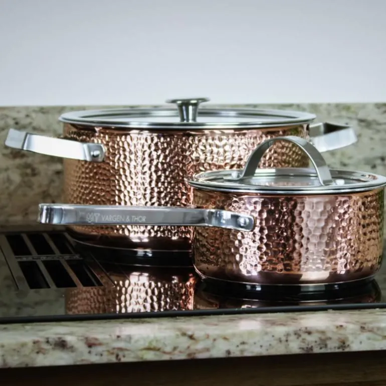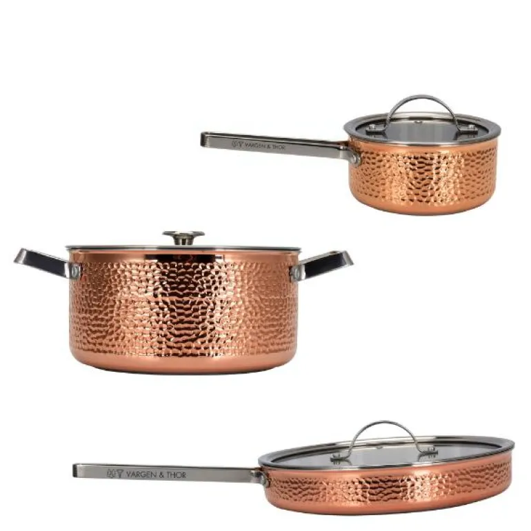 Mjølner Vera, Miranda, Modell Y grytesett i 6 deler inkludert lokk fra Vargen & Thor er et unikt sett laget av slitesterke materialer som tåler daglig bruk. Settet, produsert i vakkert polert kobber, er både funksjonelt og estetisk tiltalende, og passer perfekt på ethvert kjøkken.
