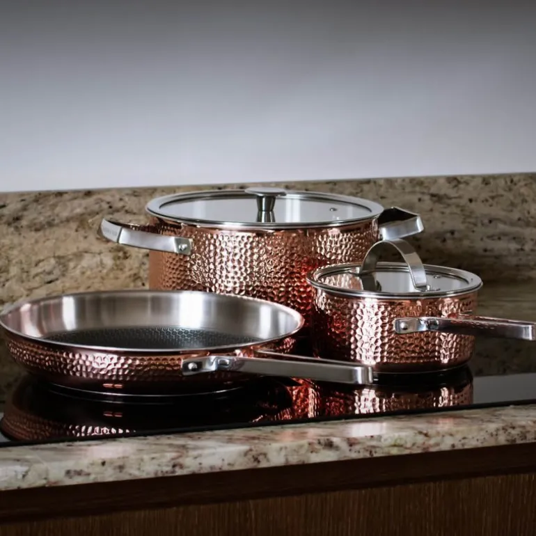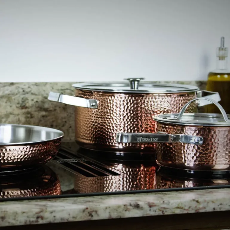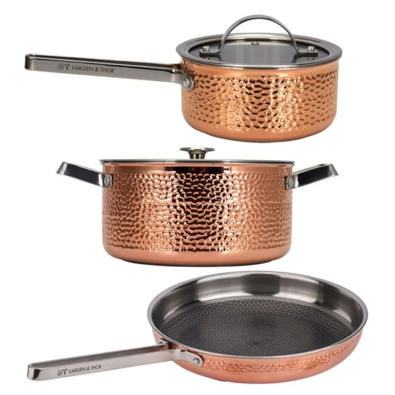 Mjölner 2 grytesett i 3 deler fra Vargen & Thor er en kombinasjon av funksjonalitet, holdbarhet og eksklusivt design i ekte hamret kobber. Settet består av en 1,6 liters sausegryte (Vera), en 4 liters gryte (Miranda) og en 28 cm stekepanne (Modell YB), alle med et unikt og tidløst uttrykk som tilfører kjøkkenet både stil og kvalitet.