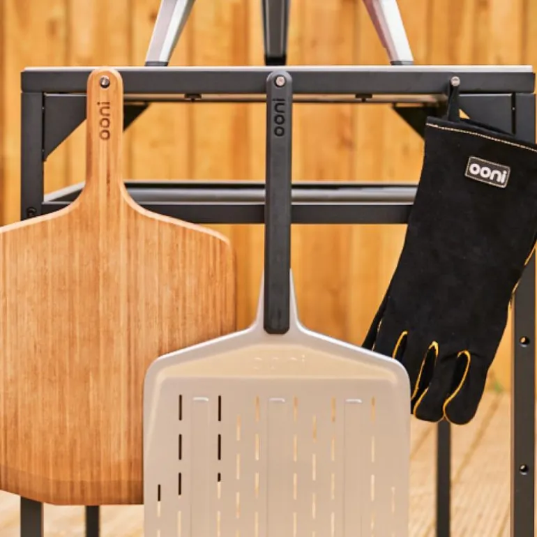Ooni modulbord i svart sørger for at du har system og orden når du fyrer opp pizzaovnen din, og at du har alt du trenger innen rekkevidde. Sett pizzaovnen oppå bordet, fyll hyller og kroker med pizzaspade, fjøler og gassflaske – og du er good to go.