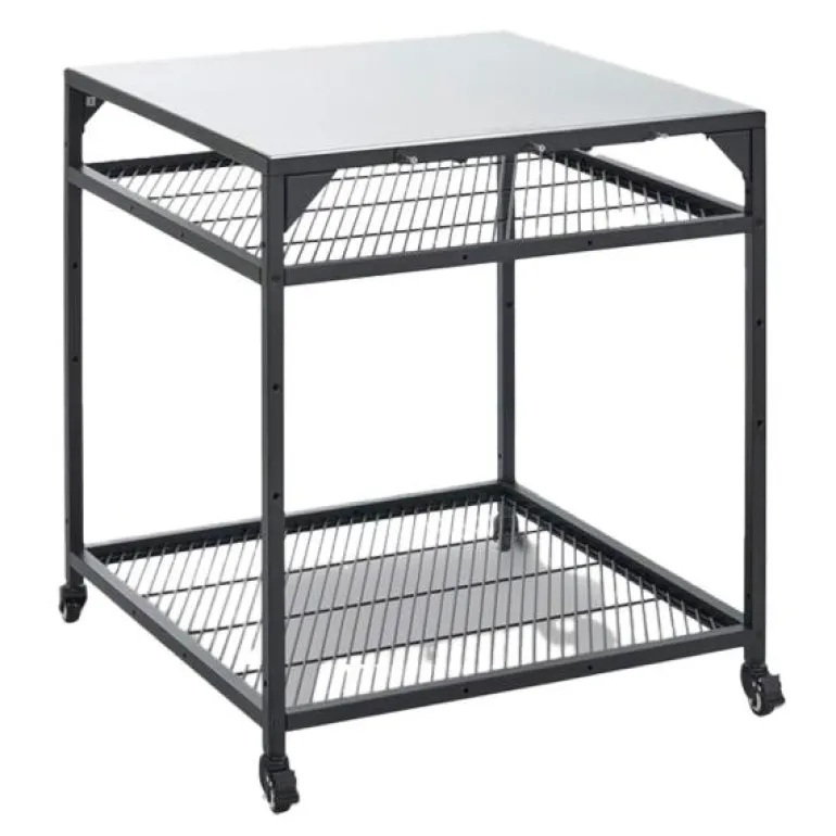 Bordet er 90 cm høyt, 80 cm bredt og 80 cm langt. Det er utstyrt med fire hjul (to låsbare), så du enkelt kan flytte rundt på pizzaovnen om nødvendig. Topplaten er laget av rustfritt stål, mens rammer og hyller er laget i pulverlakkert karbonstål.