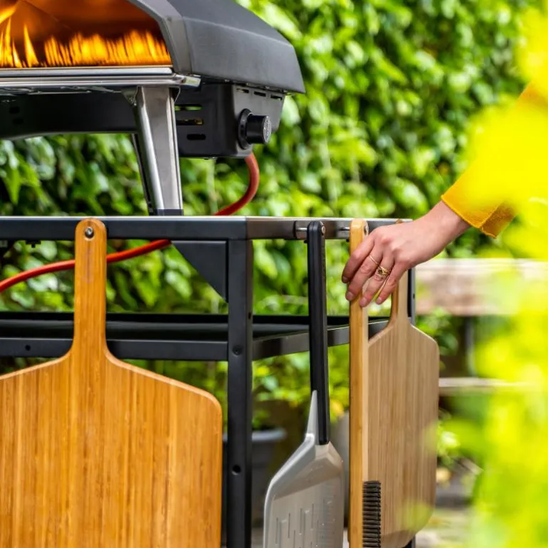 Ooni modulbord i svart sørger for at du har system og orden når du fyrer opp pizzaovnen din, og at du har alt du trenger innen rekkevidde. Sett pizzaovnen oppå bordet, fyll hyller og kroker med pizzaspade, fjøler og gassflaske – og du er good to go.