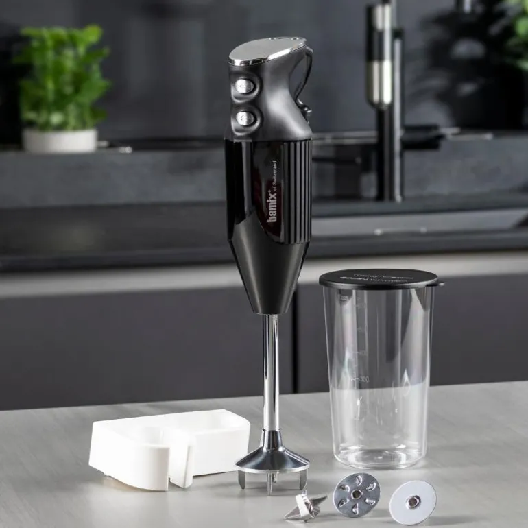 Bamix Mono-stavmikseren i sort farge er utstyrt med en 200-watts motor, som gir deg stødig og pålitelig assistanse for et bredt spekter av kjøkkenoppgaver. Dens design er fokusert på funksjonalitet, med to hastighetsinnstillinger som lar deg tilpasse bruk etter behov.