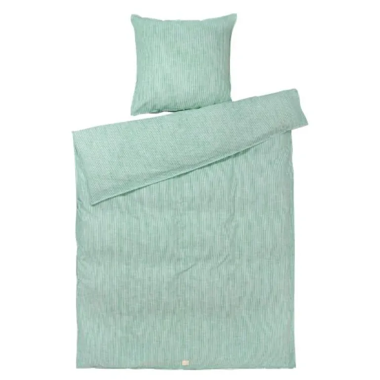Serien Monochrome er skapt i 100 % økologisk bomull og vevd på en måte som gir stoffet et rått og uformelt utseende som er inspirert av naturens strukturer med en helt spesiell overflate som føles himmelsk mot huden. Det nyeste sengesettet fra Monochrome Lines kommer i en grønn farge, og det spesielle vevet med en ujevn tråd skaper unike variasjoner i stoffets struktur og gjør fargen levende.