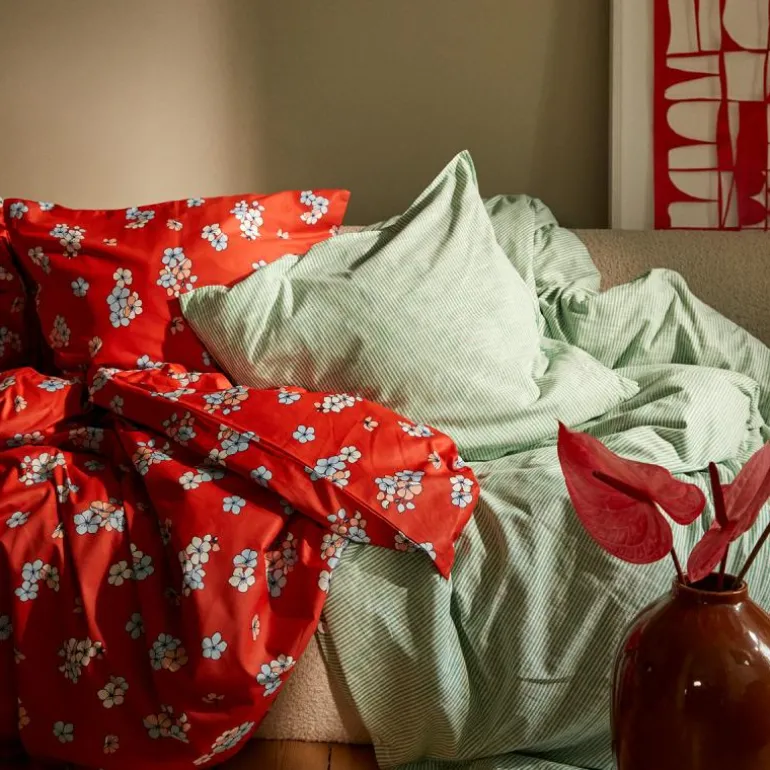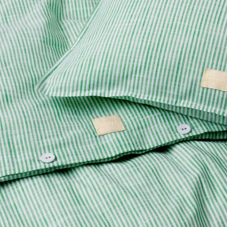 Den avdempede fargen i kombinasjon med hvite striper gir Monochrome Lines et klassisk uttrykk som også går flott sammen med puter, tepper og sengetøy fra de andre JUNA-seriene, slik at du kan mikse og matche på kryss og tvers. Monochrome Lines er mer enn bare en vakker tilføyelse til soverommet som gir en myk og god natts søvn. Sengetøyet er også GOTS-sertifisert og OEKO-TEX®-merket, slik at du kan sove trygt og drømme søtt.