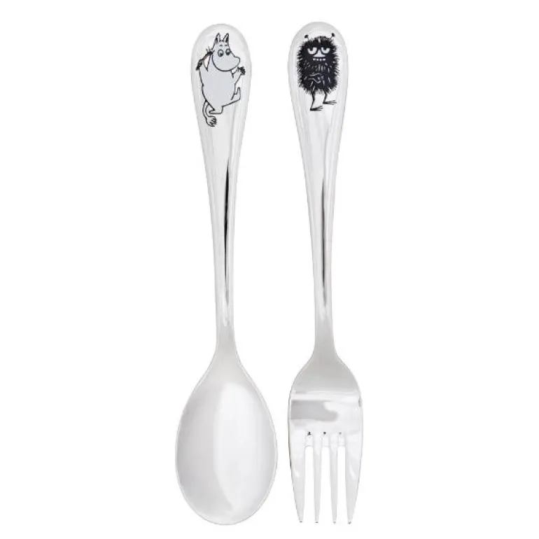 Settet består av skje og gaffel med Mummitrollet og Stinky motiv.