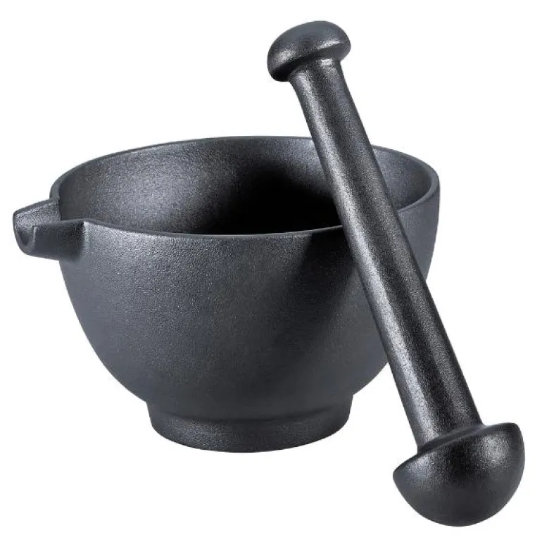 Stor, svart morter i matt støpejern. Modellen passer perfekt til tørkede krydder, så vel som urter og dip.