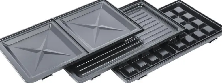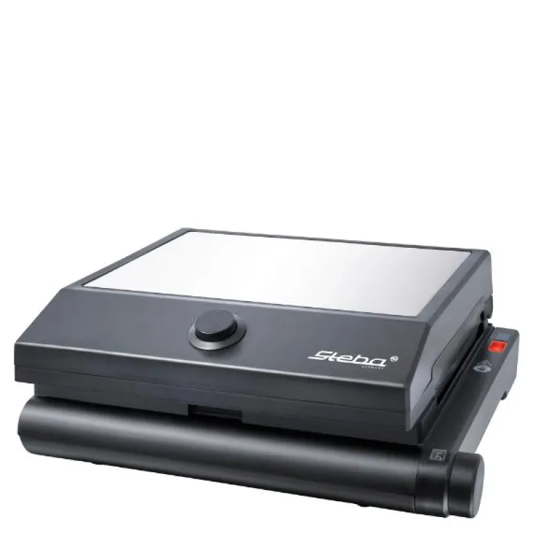 Multi Snack Maker fra det tyske merke Steba. Snacksmakeren har 3 medfølgende tallerkener som kan brukes til smørbrød, vafler eller som grill. Flisene fjernes enkelt med Easy-Click-Off-funksjonen og de er non-stick-belagt. Snackmakere har kontrolllampe og temperaturkontroll opp til 210?c. Den er også utstyrt med lås på håndtaket og anti-skli føtter. Materialet er børstet rustfritt stål.