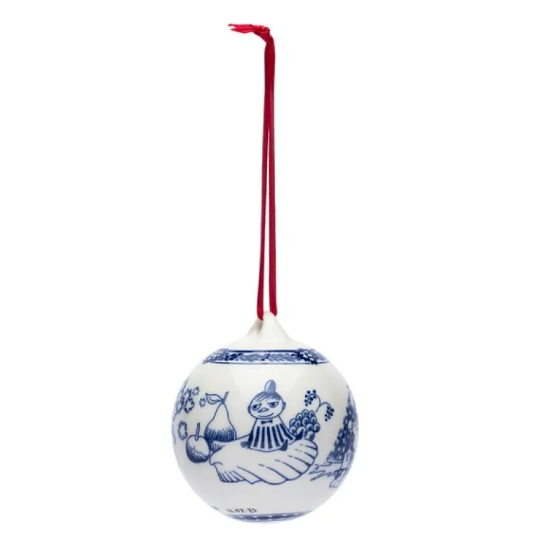 Årets julekule 2024 fra MoominArabia. Feir jul med årets nye Moomin Arabia julekule i blått og hvitt, spre julegleden med Mummitrollet, Lille My og vennene. Designet for julekulen er en tilpasning av Tove Janssons klassiske kransillustrasjon og er et flott supplement til juledekorasjonene.