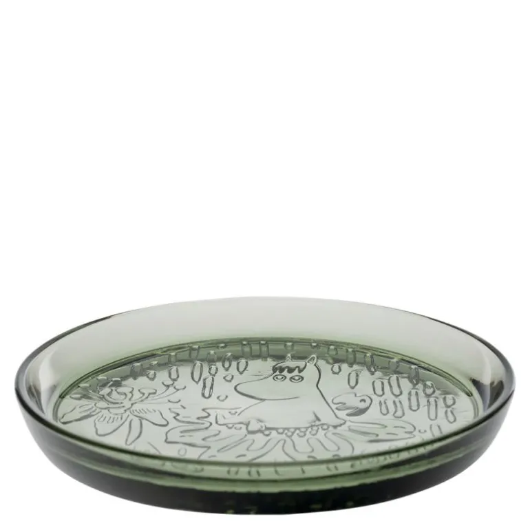 Furugrønn tallerken 15,5 cm fra MoominArabia. Utforsk den fantastiske glasskolleksjonen inspirert av Tove Janssons bok “Trollmannens hatt”. Produktene er dekorert med vakre teksturer som fanger stemningen av mystisk skog der Mummitrollene leker gjemsel.