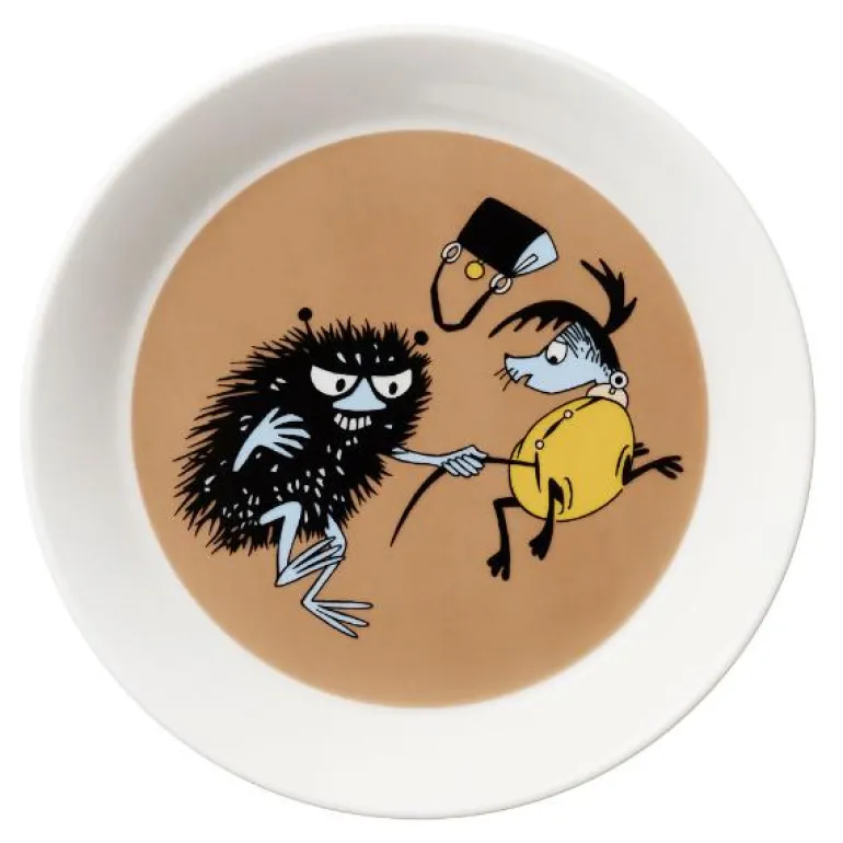 Mummi asjett 19cm Stinky i aksjon. Stinky er skurken i Mummidalen, men er likevel hyggelig. En leken hund løper rundt i Mummidalen, og den har stjålet Mummimammas veske. Stinky griper tak i hundens hale og hunden slipper taket. Mummimamma får vesken tilbake. Moomin by Arabia, asjett 19cm, Stinky i aksjon. Kan vaskes i oppvaskmaskin. Er ildfast og tåler mikrobølgeovn.