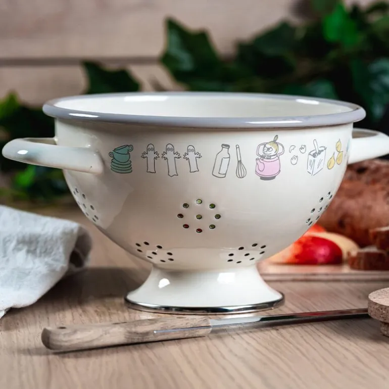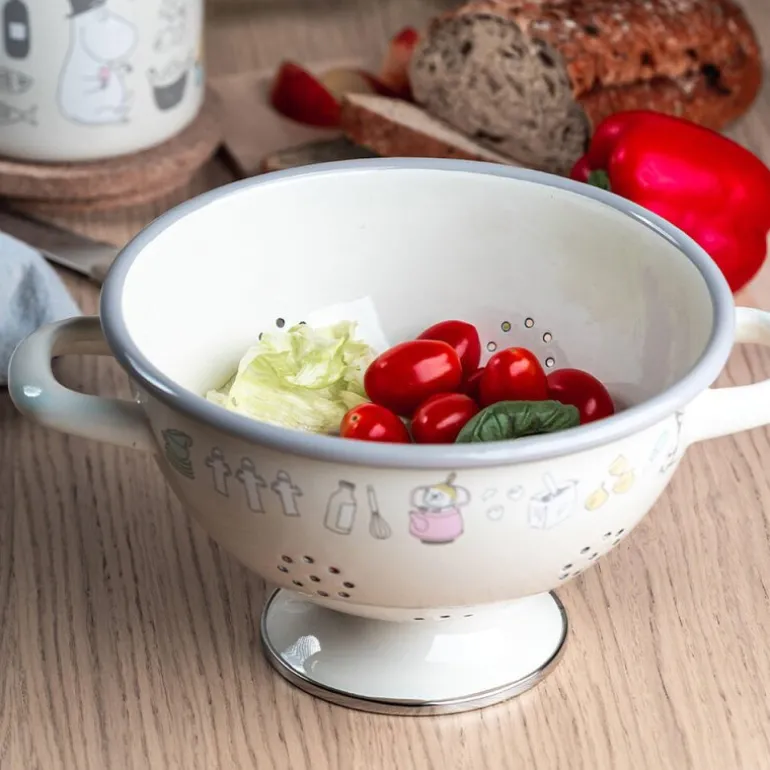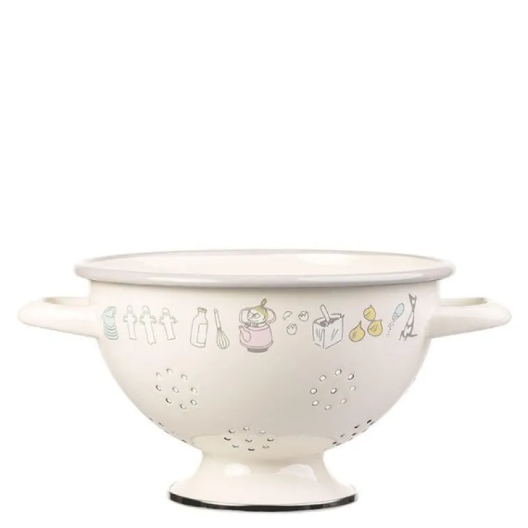 Mummi dørslag i størrelse 14x22x29 cm med det stilfulle «Mummi bon appétit»-motivet fra Muurla er et praktisk og dekorativt redskap til kjøkkenet. Laget i slitesterk emalje, kombinerer dette dørslaget funksjonalitet med et tidløst design. Perfekt for skylling av frukt, grønnsaker eller for å helle av vannet fra pasta og poteter, samtidig som det tilfører et snev av Mummi-sjarm til kjøkkenarbeidet.