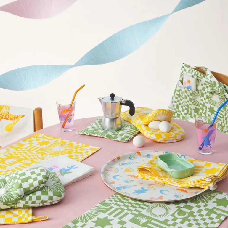 Mummi forkle «Fest» fra Moomin Arabia er det perfekte tilbehøret for sommerlige feiringer og matlaging med stil. Med sitt sprudlende design og livlige farger, henter Fest-kolleksjonen inspirasjon fra tidlige mummimønstre fra 1950-tallet. De lekne detaljene bringer en følelse av glede og nostalgi til kjøkkenet, og inviterer til fellesskap og hygge.