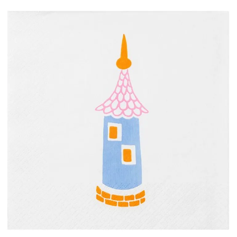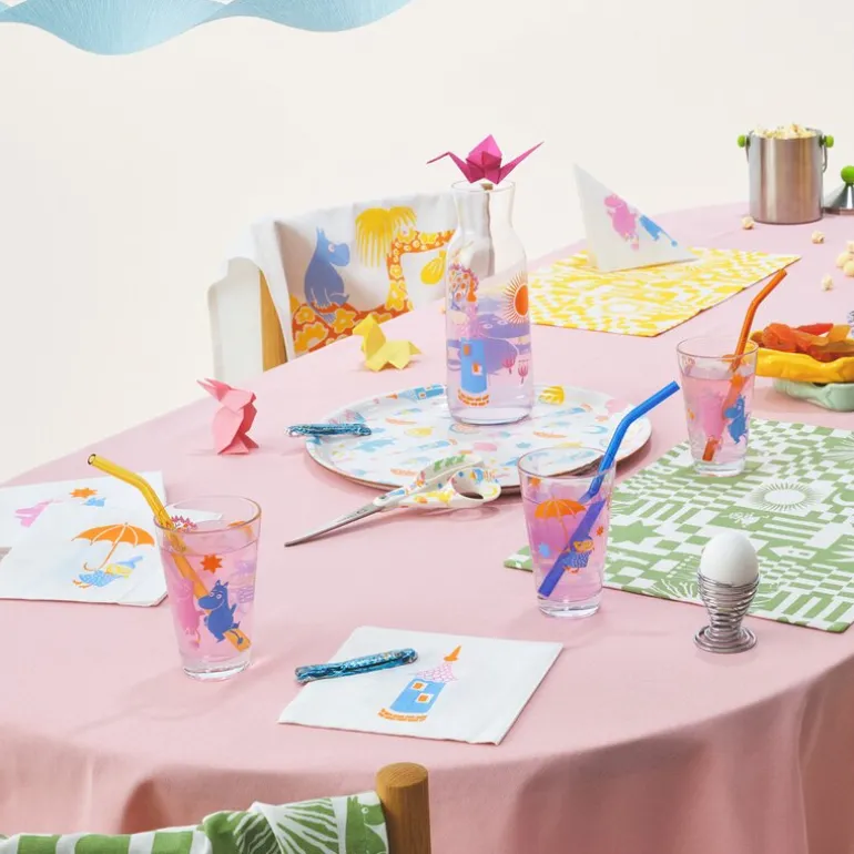 Arabia Mummi serviett 33×33 cm Fest er designet for å gjøre sommerens feiringer enda mer spesielle. Med sitt lekne design og detaljer inspirert av Tove Janssons tidlige mummimønstre fra 1950-tallet, passer disse serviettene perfekt til både hverdagsmåltider og festlige anledninger.
