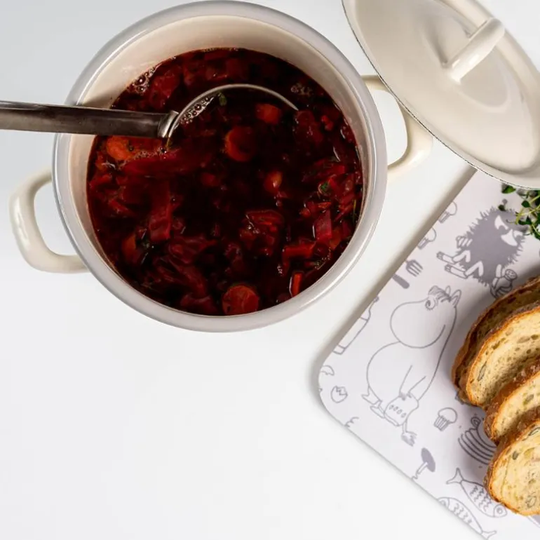 Mummi gryte med lokk på 2,5 liter i en elegant beige farge og med det sjarmerende «Mummi på kjøkkenet»-motivet fra Muurla er en perfekt kombinasjon av funksjonalitet og design. Denne emaljerte kjelen er svært slitesterk og kan brukes på alle typer ovner, inkludert åpen ild, elektrisk, keramisk og induksjon. Den er ideell til både daglig matlaging og spesielle anledninger.