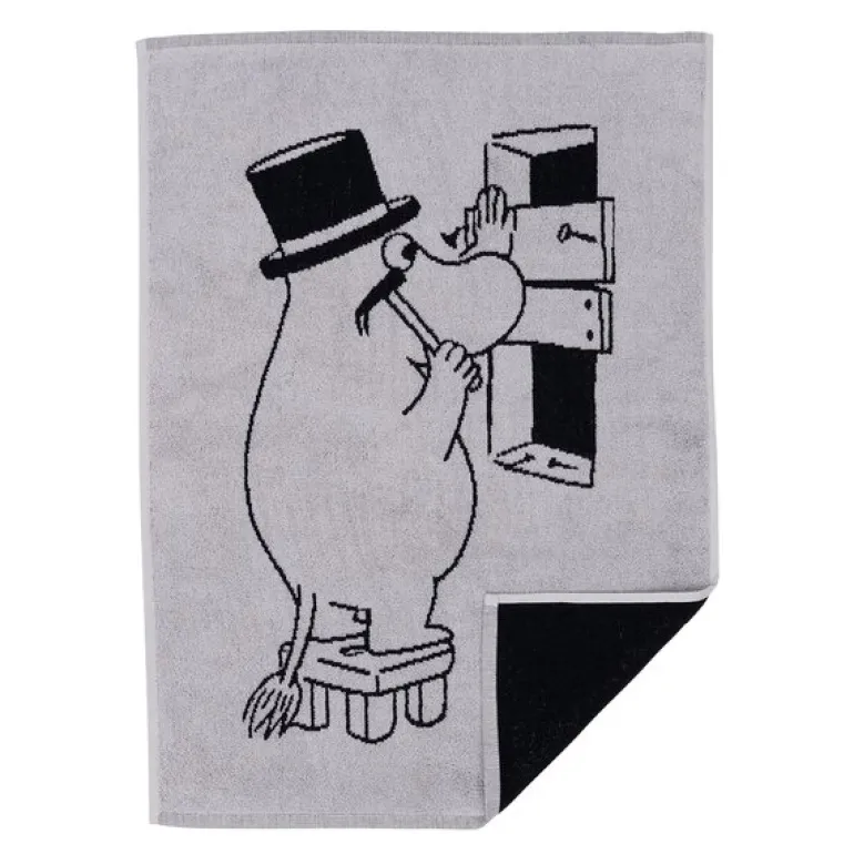 MoominArabia Mummi håndkle 50×70 cm Mummipappa grå gir en myk og koselig følelse til din daglige rutine. Dette håndkleet er perfekt for alle Mummi-elskere, prydet med sjarmerende illustrasjoner av Mummipappa som alltid er i gang med å fikse noe i huset eller i Mummidalen. Enten det er å reparere en bro etter et uvær eller forberede seg til vinteren, er Mummipappa alltid klar med sine pålitelige verktøy. Laget av 100% økologisk bomull, er dette håndkleet både skånsomt mot huden og miljøvennlig.