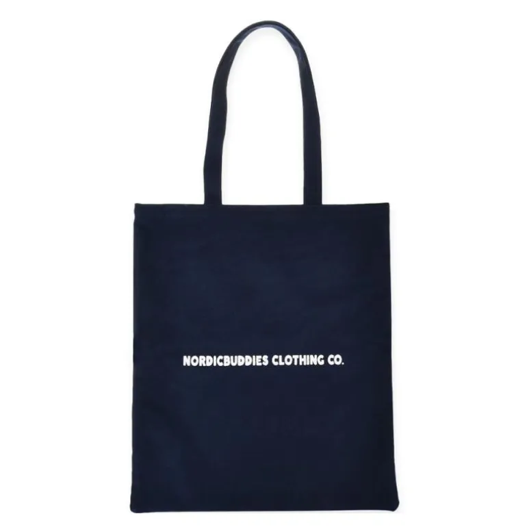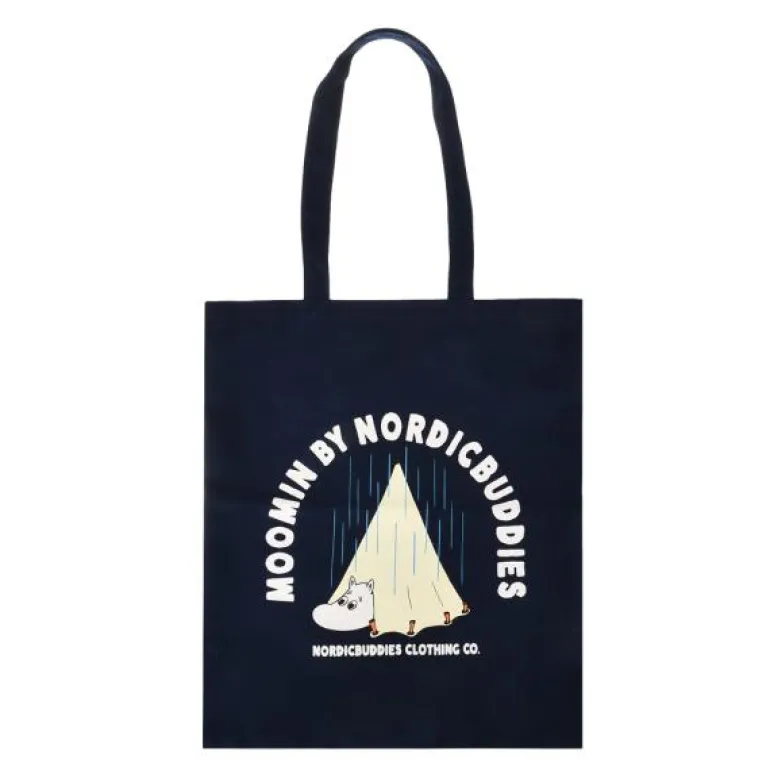Marinblå Mummi tote bag fra Nordicbuddies med en illustrasjon av Mumintroll på forsiden og Nordicbuddies-logo på baksiden. Flott veske til å ta med seg matvarene hjem i! Vesken er etisk produsert under Fair Wear-kontroll og produsert i en fabrikk som bruker vind- og solenergi i produksjonen. Carbon Trust- og Organic Textile-sertifisert. Materiale: 100 % økologisk bomull. Klassisk stil. Størrelse: 38 x 42 cm