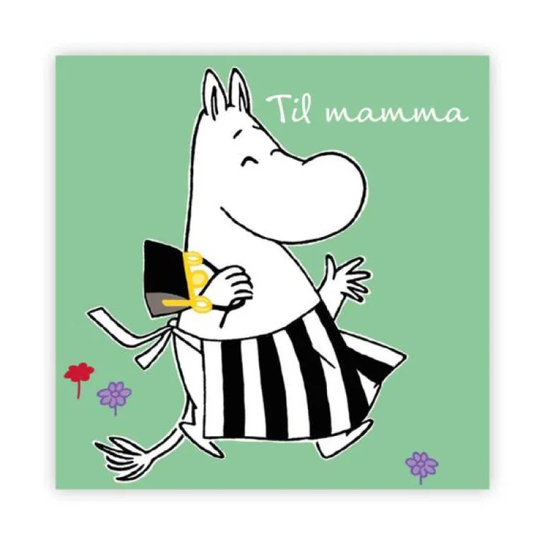 Lite dobbelt Mummi-kort med konvolutt. Kortet er grønt med motiv av Mummimamma som spaserer fornøyd. Tekst på kortet: Til mamma. Kortet er blankt inni. Perfekt til små og store gaver. Mål: 7,5 x 7,5 cm