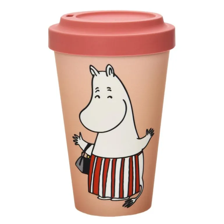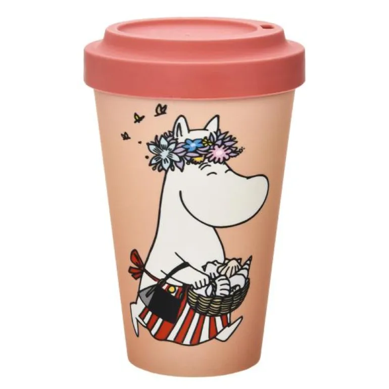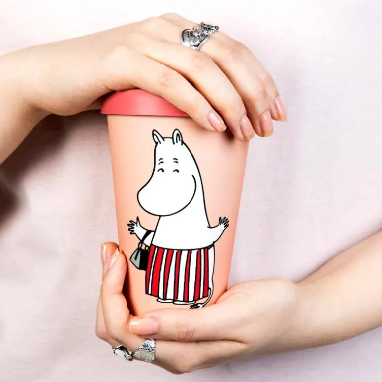 Praktisk fersken farget Mummi takeaway-krus fra Nordicbuddies som holder kaffen eller teen varm! Kruset har ulike illustrasjoner av Mummimamma som farter rundt – og vesken er selvsagt med. Kruset er laget av PLA (polylaktid), som er et helt biologisk nedbrytbart og fornybart materiale. Det ser ut som plast, men inneholder ikke fossilbasert plast i det hele tatt. Lokket og «hylsen» på kruset er laget av silikon. Både materialet i koppen og pappen som brukes i emballasjen, er resirkulerbare. Volum: 450 ml. Pakken inneholder også en hylse til kruset som beskytter fingrene dine når du holder på varm drikke. Kruset og lokket kan vaskes i maskin. Krusene må ikke settes i mikrobølgeovnen.