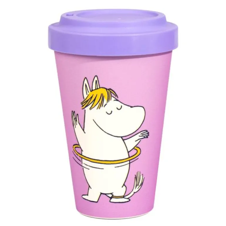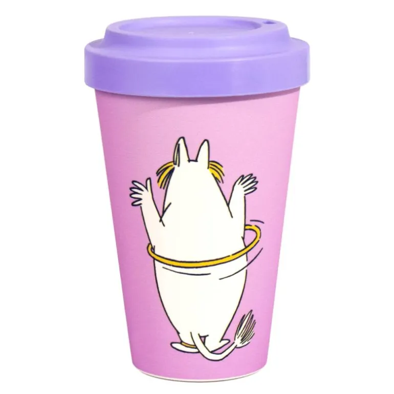 Søtt, rosafarget Mummi takeaway-krus fra Nordicbuddies som holder kaffen eller teen varm! Kruset har ulike illustrasjoner av Snorkfrøkenen som danser og nyter livet.