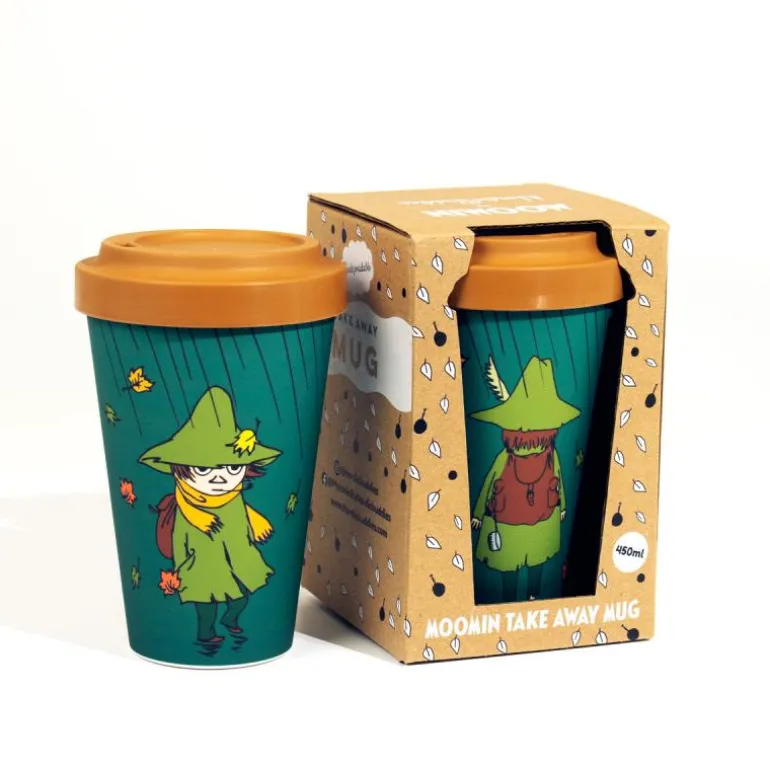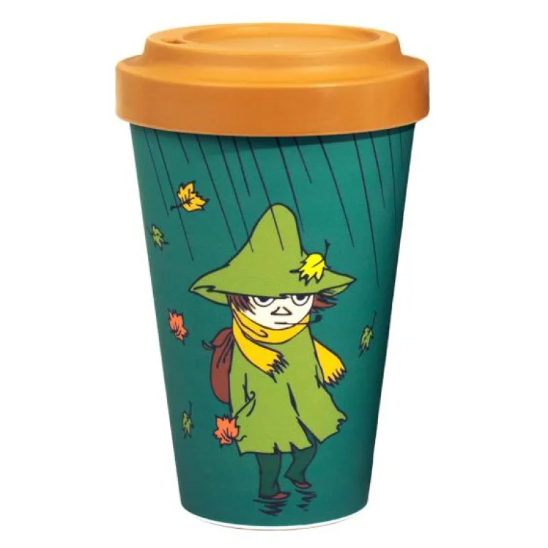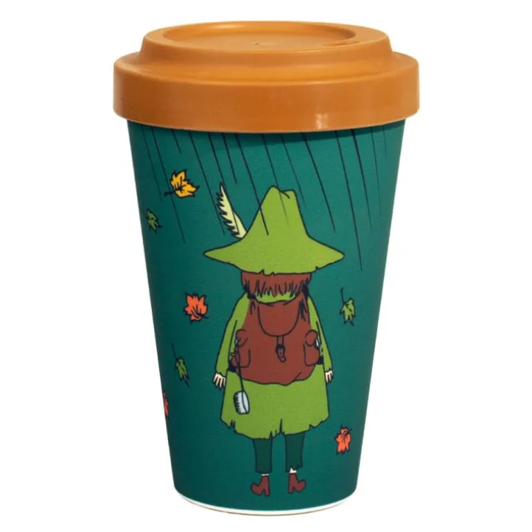 Praktisk, mørkegrønt Mummi takeaway-krus fra Nordicbuddies som holder kaffen eller teen varm! Kruset er illustrert med Snusmumrikken som er ute på eventyr om høsten.