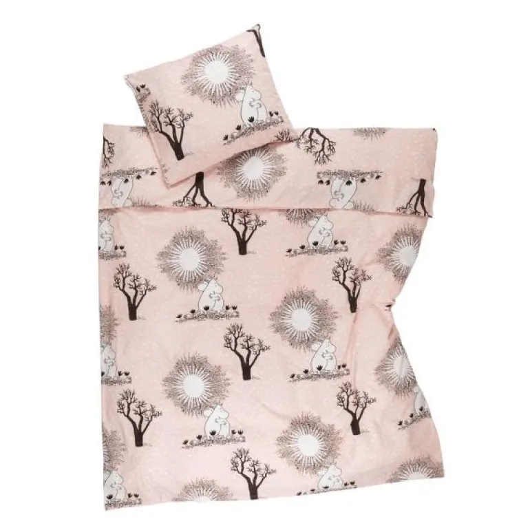 Fall i søvn omsluttet av kjærlighet. De to kjærestene Snorkfrøken og Mummitrollet holder tett rundt hverandre etter nok et spennende eventyr. Originalillustrasjonen fra Tove og Lars Janssons tegneserier fås nå også som sengetøy.