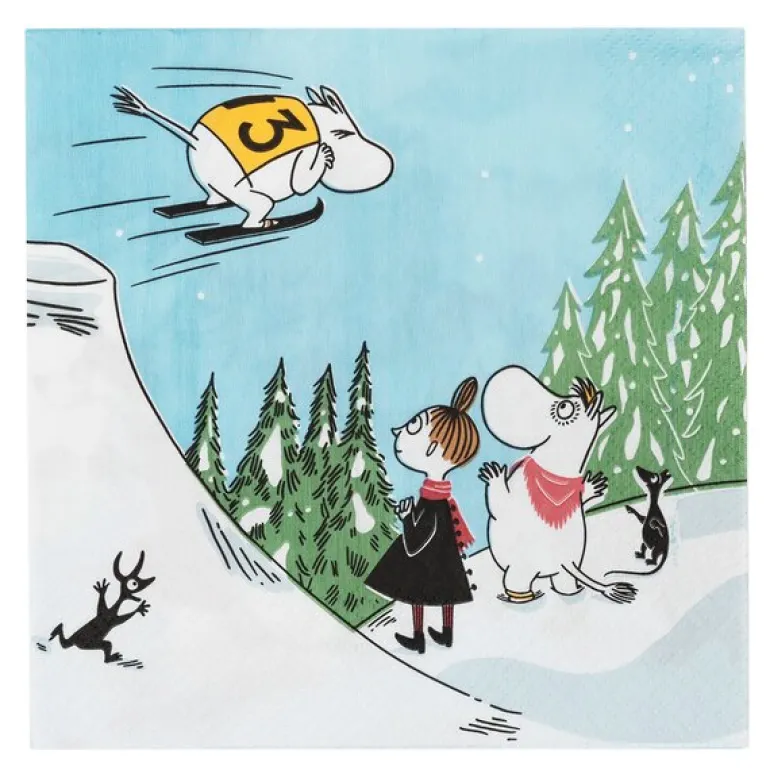 Mummi serviett 33×33 cm med motiv fra skihopp-eventyret bringer et snev av vintermagi til bordet ditt. Mummitrollet er klar for en stor utfordring når han deltar i skihoppkonkurransen, alt for å imponere Snorkfrøken. Det dristige svevet gjennom luften vekker både beundring og bekymring, og Snorkfrøken innser farene i siste liten. Selv om Mummitrollet gjør sitt beste, ender han med et uventet møte med trærne, til stor underholdning.