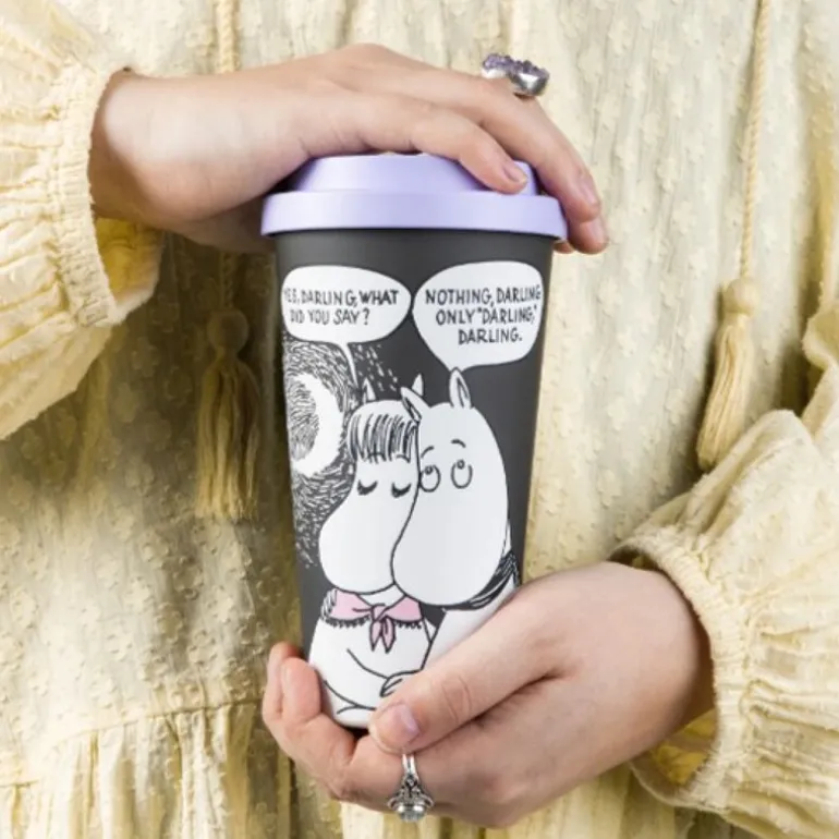 Mummi take away-krus fra Nordicbuddies med det romantiske motivet av Mummitrollet og Snorkfrøken er et praktisk og stilig valg for drikke på farten. Det svarte kruset har en kapasitet på 45 cl, som gjør det velegnet for kaffe, te eller andre favorittdrikker. Det lekne designet, som viser Mummitrollet og Snorkfrøken i en kjærlighetsscene, gir en hyggelig og personlig touch til hverdagen.