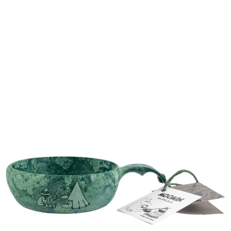 Praktisk mummi turskål 33 cl grønn med motiv av Camping fra Kupilka er en funksjonell og stilren skål designet for både små og store eventyrere. Med en kapasitet på 33 cl er denne lette og robuste turskålen laget av det slitesterke Kareline BioNFC-materialet, som tåler utfordringene i naturen. Materialet gir ikke bare en pålitelig skål, men muliggjør også detaljerte lasergraveringer som fremhever Mummitrollet og Snusmumrikens campingeventyr.