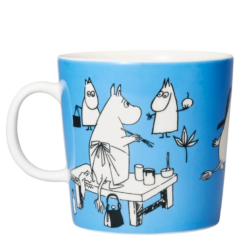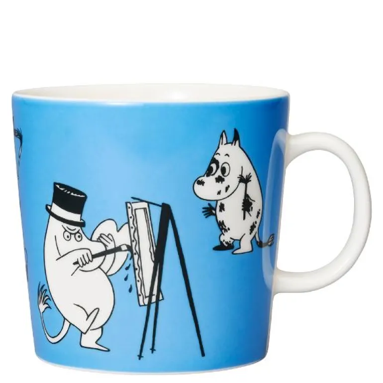I illustrasjonen på det blå kruset ser vi hele Mummifamilien som lager kunst. Mummitrollet maler bokstaver og han har klart å søle maling på seg selv. Mummimamma maler selvportretter og Mummipappa maler med oljemaling.